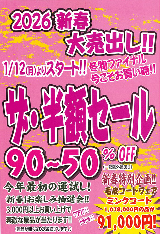 1/12(月)~2026新春大売り出し「ザ・半額セール」開催!