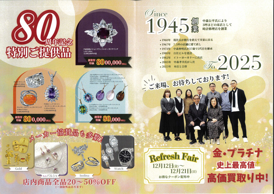宝石・メガネ・時計 中森 綱島駅前店では、12/7(日)〜12/8(月)「80周年創業祭」を開催します!